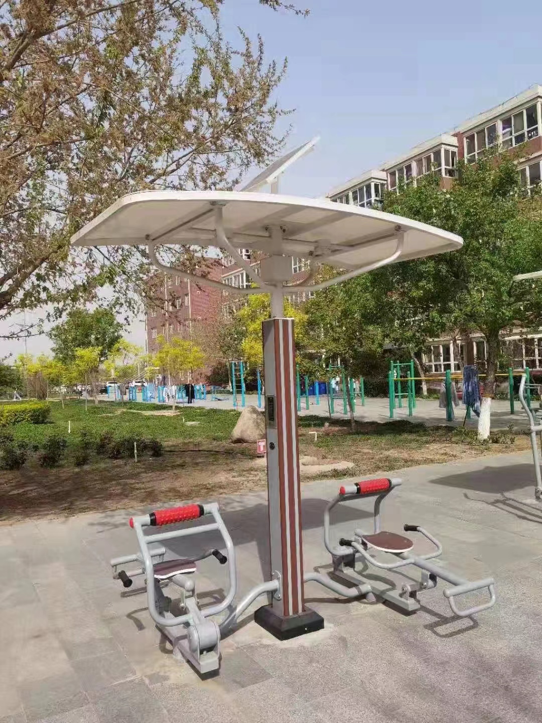 鍛煉方法:坐于座位上,手握扶手,腳踏圓管,腿部用力使背部后展,最多使用人數(shù)為2人,每個站位為1人。